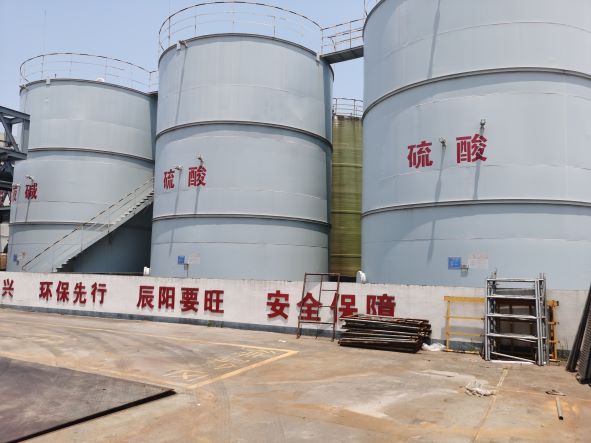 辰陽化工20190828日取得衢州市應急管理局核發的危險化學品經營許可證(有效期至20220827,證書編號:衢應急經(龍)字2019000010,許可經營范圍:帶儲存經營鹽酸(液體儲量3000噸)、硫酸(液體儲量1550噸)、液堿(液體儲量900噸),共計3種;無倉儲經營氫氧化鈉、氨溶液[含氨>10%]、次氯酸鈉溶液[含有效氯>5%]、1,2-二甲苯、13-二甲苯、1,4-二甲苯、二甲苯異構混合液、氟化氫[無水]、氫氟酸、環己酮、環己烷、三氯甲烷、四氯乙烯、11,2,2-四氯乙烷、11-二氯乙烯、1,2-二氯乙烯、三氯乙醛[穩定的]、環氧樹脂、乙酸乙酯、甲醇、乙醇[無水]、涂料用稀釋劑、甲醛溶液、甲酸、乙酸[含量>80%]、乙酸溶液[10%<含量≤80%]、磷酸、碳酸鋰、氫氧化鋰、氯化鈣;易制爆:過氧化氫溶液[含量>8%]、硝酸、六亞甲基四胺,共計33種(其中碳酸鋰、氯化鈣為非危險化學品)經營儲存場所位于廠區北側,包括1座戊類罐區(1500m3液堿、2500m3硫酸罐和6500m3鹽酸罐)、1座裝卸車臺及輔助車間1F(包裝間)