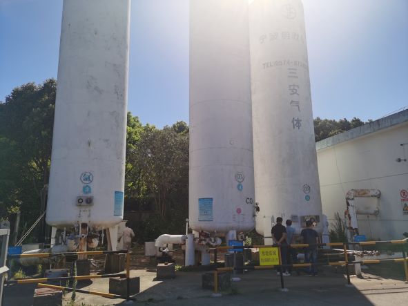 舟山億洋氣體有限公司(以下簡稱“舟山億洋”)成立于200311月,主要從事工業氣體充裝、儲存經營,廠區設有氧氣、氮氣、氬氣、二氧化碳儲存及充裝設施。于202076日取得舟山市定海區應急管理局頒發的《危險化學品經營許可證》,編號:定應急危經字[2020]0019。許可范圍:*儲罐區:氧[液化的]50立方米儲罐1個)、氮[液化的]20立方米儲罐1個)、氬[液化的]20立方米儲罐1個)、二氧化碳[液化的]50立方米儲罐1個、30立方米儲罐1個),充裝間:氧[壓縮的]1.2t、氮[壓縮的]0.27t、氬[壓縮的]0.5t、二氧化碳[液化的]1t*年充裝:氧[壓縮的]28萬瓶、氮[壓縮的]5萬瓶、氬[壓縮的]1.5萬瓶、二氧化碳[液化的]2萬瓶。有效期至202376日。